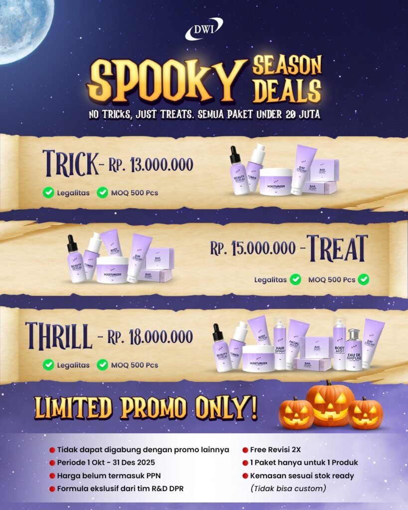 Oleh karena itu, jangan tunda lagi. Manfaatkan promo Spooky Season Deals dari PT Dwi Prima Rezeky untuk memulai langkah pertama Anda di dunia bisnis kecantikan.
